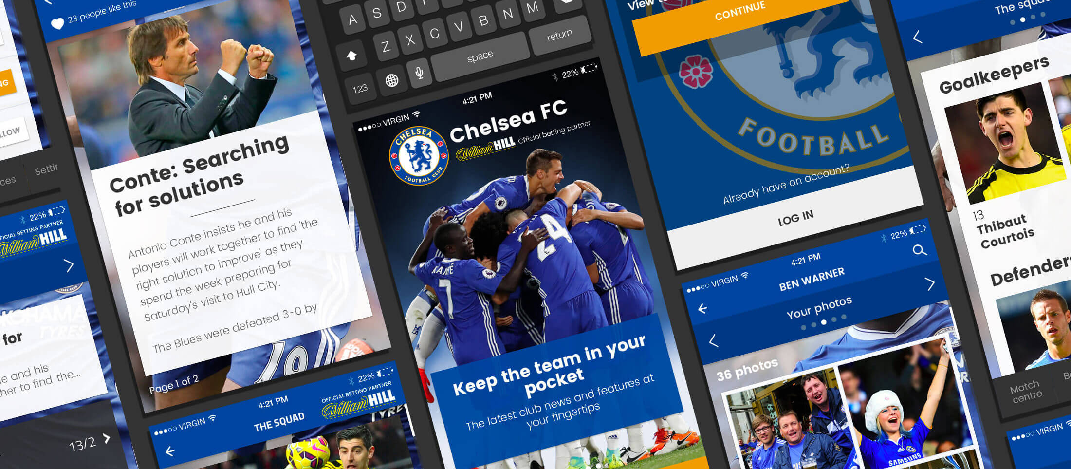 As the lead designer at IntechnologyWifi I was briefed with creating a set of designs for a new Chelsea iOS and Android app where users could get the latest game news, club info and match results. The app also allowed in-app betting with William Hill, the official Chelsea FC betting partner.
